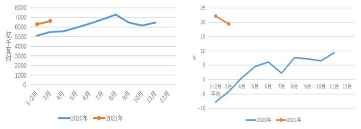 1-3月份,全國工業用電量同比增長23.9%,增速同比提高32.6個百分點。全國制造業用電量同比增長26.6%,增速同比提高35.7個百分點。制造業中,四大高載能行業合計用電量同比增長18.9%,其中,有色行業用電量同比增長12.1%,黑色行業同比增長20.9%,建材行業同比增長40.9%,化工行業同比增長14.0%;高技術及裝備制造業合計用電同比增長44.0%,其中,汽車制造業、電氣機械和器材制造業、通用設備制造業同比增長均超過50%,分別為61.3%、55.2%和52.1%;消費品制造業合計用電同比增長34.7%,其中,家具制造業、木材加工和木/竹/藤/棕/草制品業同比增長均超過50%,分別為61.9%和54.2%。