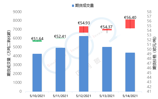 - 2021年5月10日至5月14日,由于歐盟碳市場投資者的強勢買盤以及歐盟氣候負責人對于歐盟碳價較為消極的干預政策,歐盟碳價在本周再次呈現較大漲幅并接連刷新記錄,由51.64歐元/噸上漲至56.40歐元/噸,漲幅達9.22%。